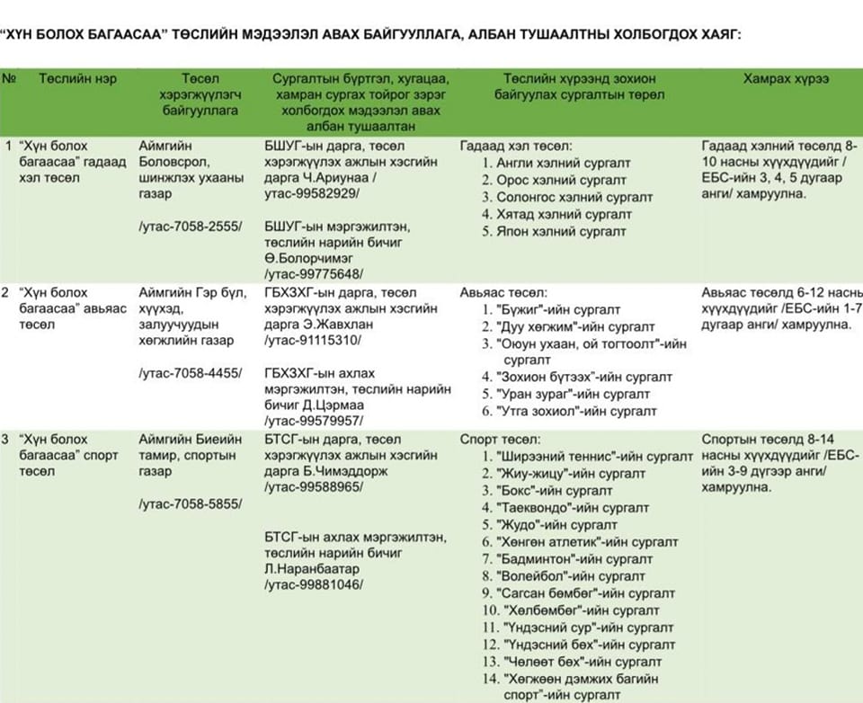 "ХҮН БОЛОХ БАГААСАА" ТӨСЛИЙН ХҮРЭЭНД ЯВАГДАХ СУРГАЛТ, ДУГУЙЛАНГИЙН ТАЛААРХ МЭДЭЭЛЛИЙГ ДАРААХ ДУГААРУУДААС АВАХ БОЛОМЖТОЙ